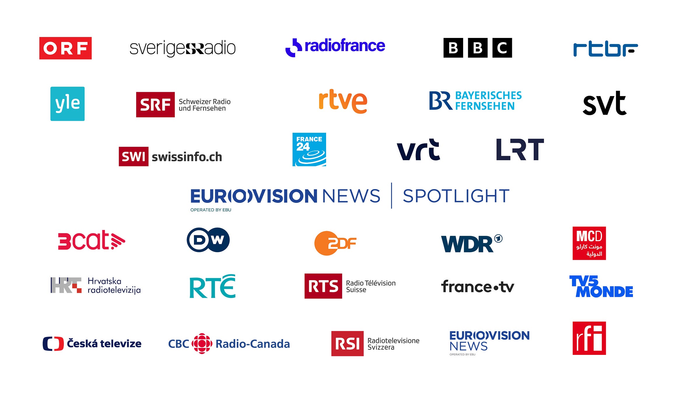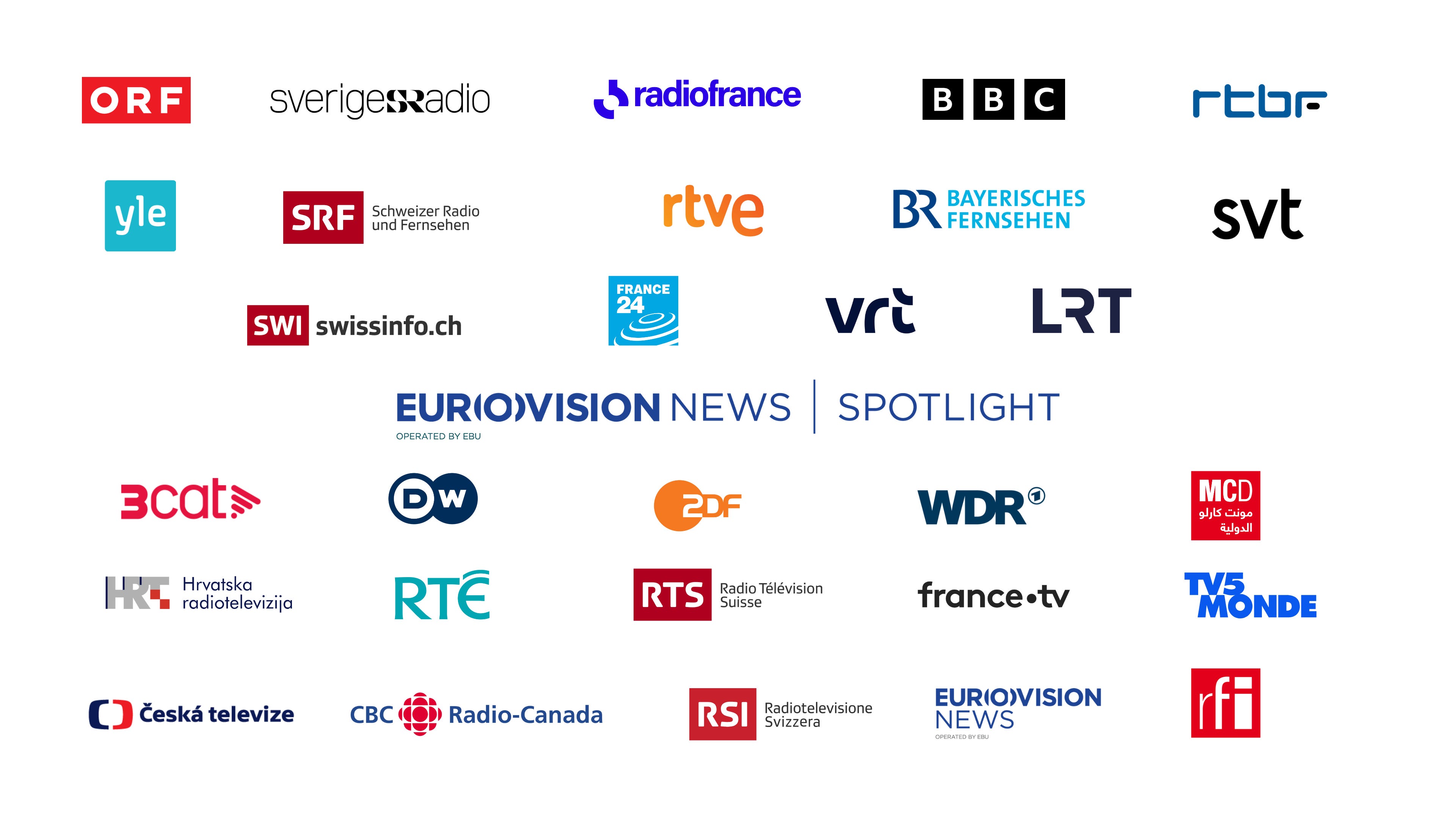 ORF (Austria), RTBF (Belgium), VRT (Belgium), CBC / Radio-Canada (Canada), HRT (Croatia), Česká televize (Czech Republic), Yle (Finland), France Télévisions (France), Radio France (France), RFI (France), France 24 (France), Monte Carlo Doualiya (France), TV5MONDE (France, Belgium, Switzerland, Monaco, Canada), DW (Germany), ZDF (Germany), BR (Germany), WDR (Germany), RTÉ (Ireland), LRT (Lithuania), RTVE (Spain), 3CAT (Spain), Sveriges Radio (Sweden), SVT (Sweden), SRF (Switzerland), RTS (Switzerland), RSI (Switzerland), Swissinfo (Switzerland), BBC (United Kingdom).