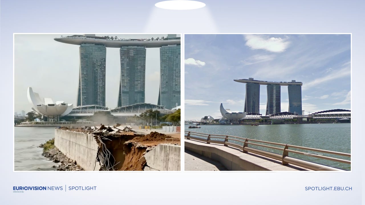 The video also has a high-definition, slow-motion quality that is commonly seen in AI-generated content. The men seen in the lower part of the clip are at first unmoving, until they start to run unnaturally when the bank collapses. AI video generators often have a logo or watermark in a lower corner of the frame, which is in this case covered by a text box saying “Marina bay”. This may be covering an AI logo.