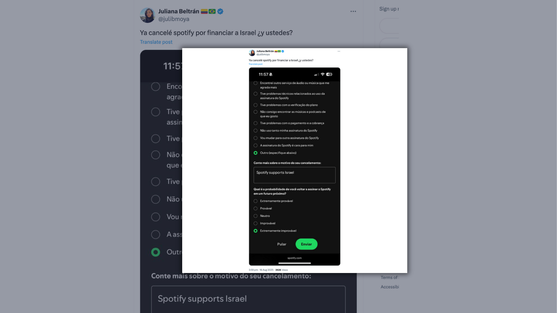 X (formerly Twitter). (2025). Available at: Ya cancelé spotify por financiar a Israel ¿y ustedes? [Accessed 25 Nov. 2025].