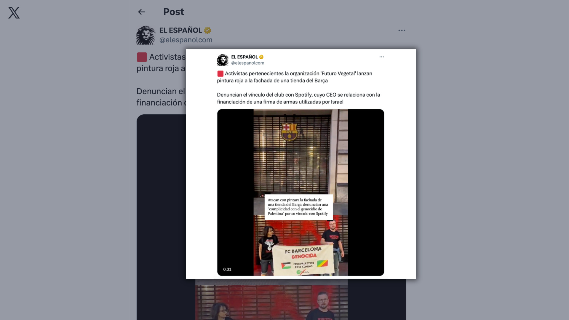 X (formerly Twitter). (2025). Available at: Activistas pertenecientes la organización ‘Futuro Vegetal’ lanzan pintura roja a la fachada de una tienda del Barça [Accessed 24 Nov. 2025].