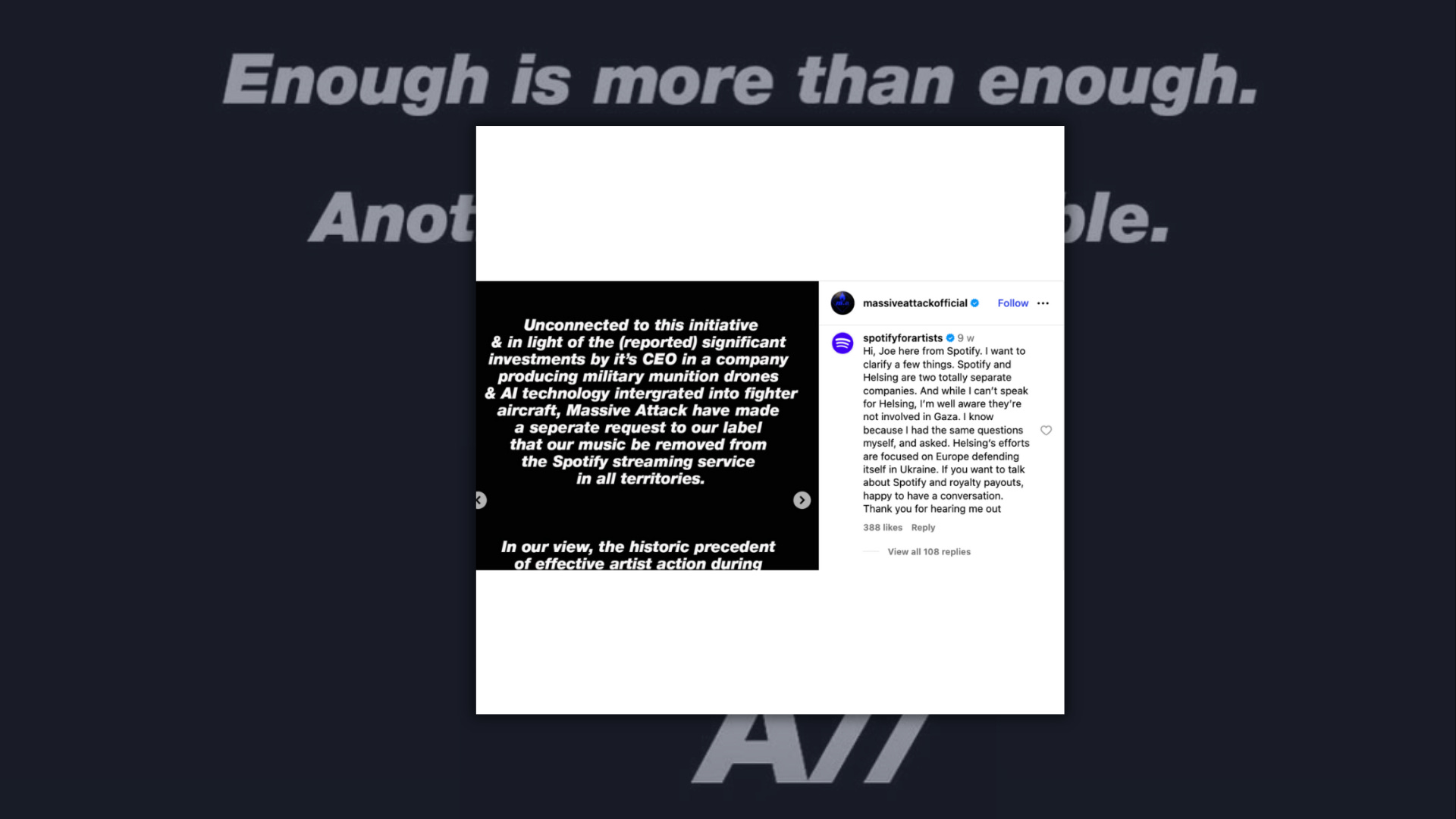Spotify has also sought to separate itself from the Helsing story. An employee operating an official Spotify for Artists account commented on the Massive Attack statement, writing: “I want to clarify a few things. Spotify and Helsing are two totally separate companies. And while I can’t speak for Helsing, I’m well aware they’re not involved in Gaza. I know because I had the same questions myself, and asked. Helsing’s efforts are focused on Europe defending itself in Ukraine. If you want to talk about Spotify and royalty payouts, happy to have a conversation.”