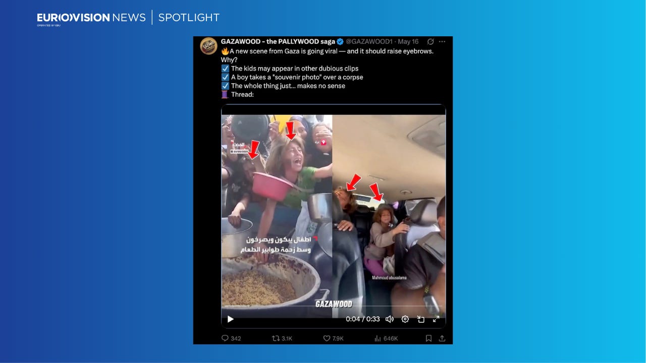 On May 16, an account on X with the handle @GAZAWOOD1 with over 76,000 followers juxtaposed two videos, one showing a chaotic scene at a charity kitchen with children being crushed as they try to get food and another showing a local journalist transporting crying and terrified children in his car after a bombing. The account suggests that the girls seen in both videos are the same ones and the events depicted are staged.