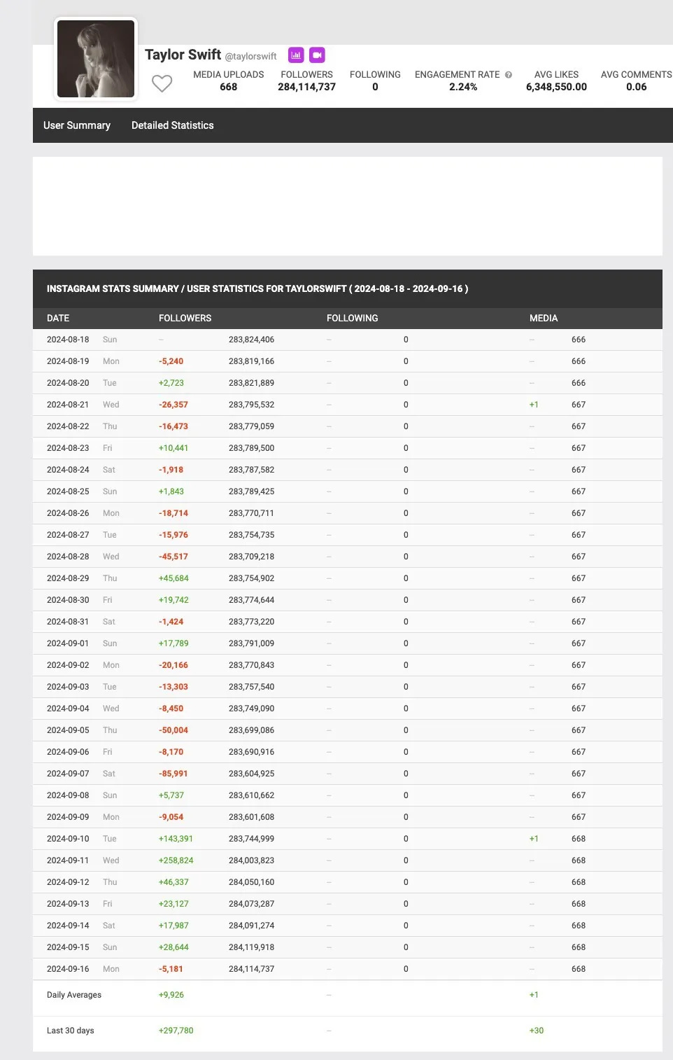 Taylor Swift’s Instagram Monthly Stats (Social Blade Instagram Statistics) Socialblade.com. Available at: https://socialblade.com/instagram/user/taylorswift/monthly (Accessed: 16 September 2024).