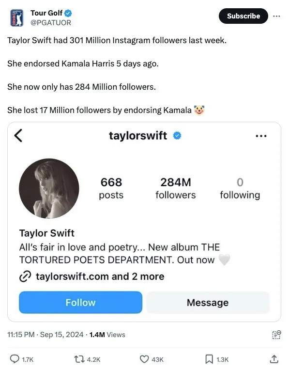 The post included a screenshot showing Taylor Swift’s current following of 284 million, along with the caption: “Taylor Swift had 301 Million Instagram followers last week. She endorsed Kamala Harris 5 days ago. She now only has 284 Million followers. She lost 17 Million followers by endorsing Kamala.”
