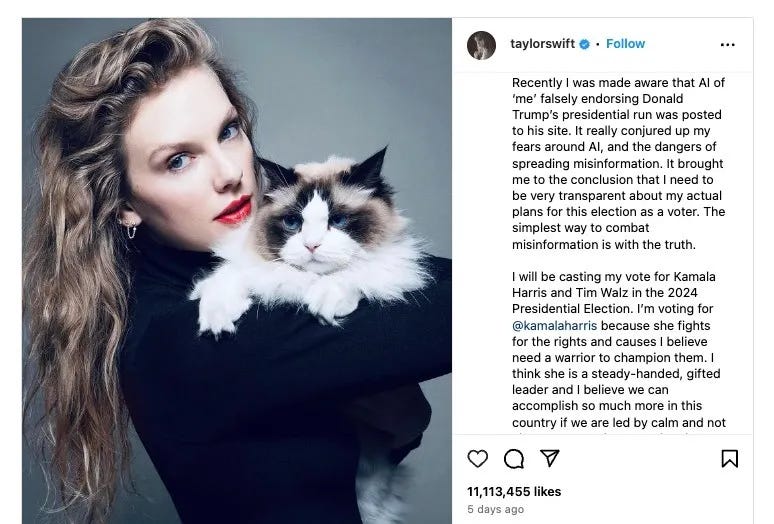 Taylor Swift formally endorsed Kamala Harris on the evening of Tuesday, September 10, with a message on Instagram that referenced Donald Trump’s recent use of AI to imply that the singer had lent him her support (we debunked this on Spotlight here.)