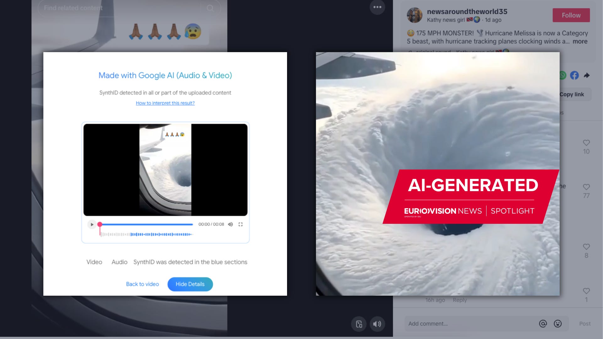 That’s how we were able to confirm the background of this video, which had almost half a million views and no AI label, and was also circulating amid Hurricane Melissa.