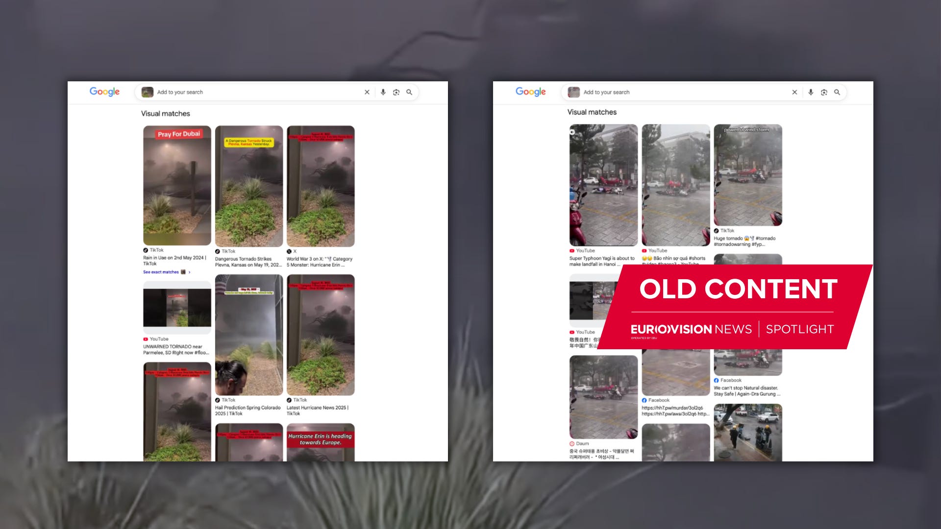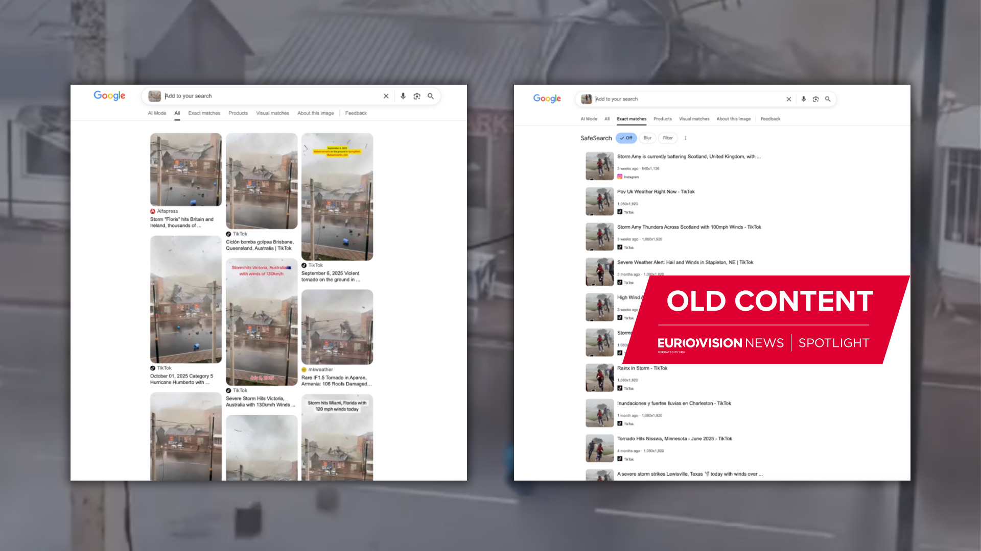 The viral video featured a dozen short clips stitched together as a compilation. Our analysis showed that most of these clips had previously been used to depict other storms — many of them on multiple occasions, as could be seen via a reverse image search on Google Lens.