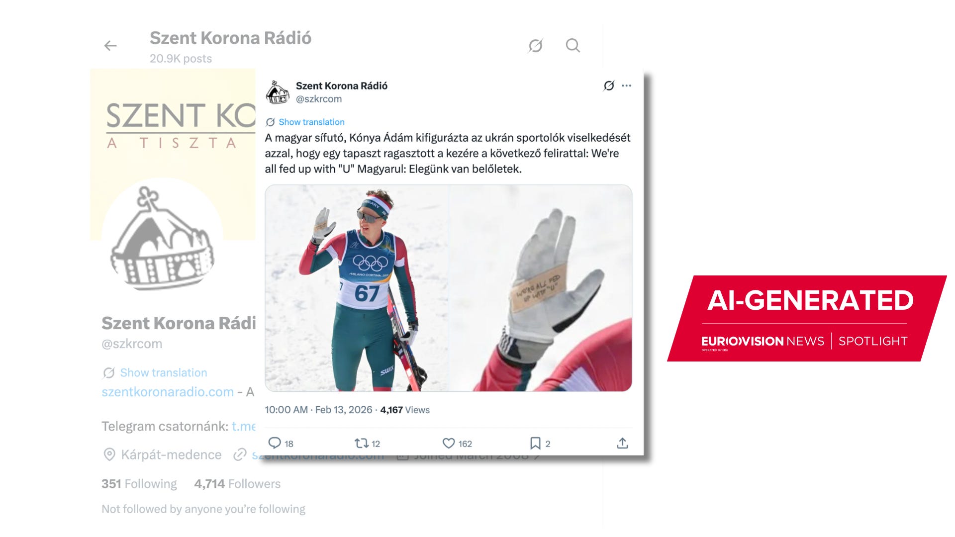 A Google Lens reverse search revealed that the original photo was shared on the official Team Hungary Facebook page. The picture was taken during a cross-country ski competition on February 8, in Tesero, and features Konya waving and showing the glove without the sticker.