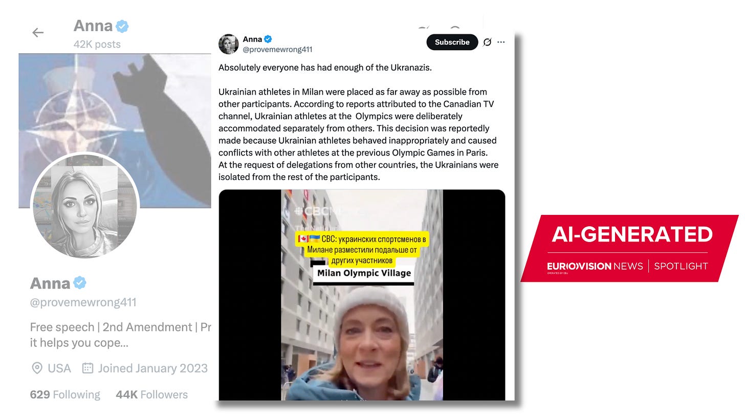 Another video (archived here) featuring CBC News chief correspondent Adrienne Arsenault became viral on social media after being altered with AI, spreading misinformation about Ukrainian athletes at the Olympic village.