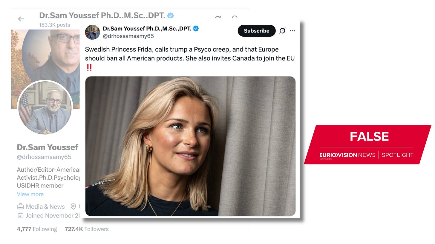 For example, X user @drhossamsamy65, shared the picture (archived here) on February 8, 2026, with the caption, “Swedish Princess Frida, calls trump a Psyco creep, and that Europe should ban all American products. She also invites Canada to join the EU”. The picture had garnered over 77,000 views as of February 16.