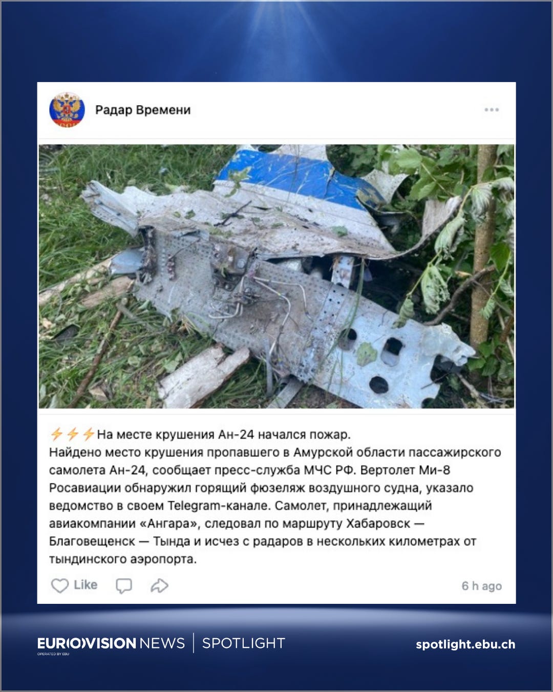 The photo above was used by Mir24 — A Russian TV station. It was used as a headline image in a report about the Angara Airlines crash on July 24, but a reverse image search revealed it actually shows the wreckage from a crash in the same region in 2011. The Bureau of Aircraft Accidents Archive, a Geneva-based NGO that has been recording aviation accidents since 1990, had this picture among several photos of an Antonov AN-24 crash on August 8, 2011, in Blagoveshchensk, Amur Oblast.
