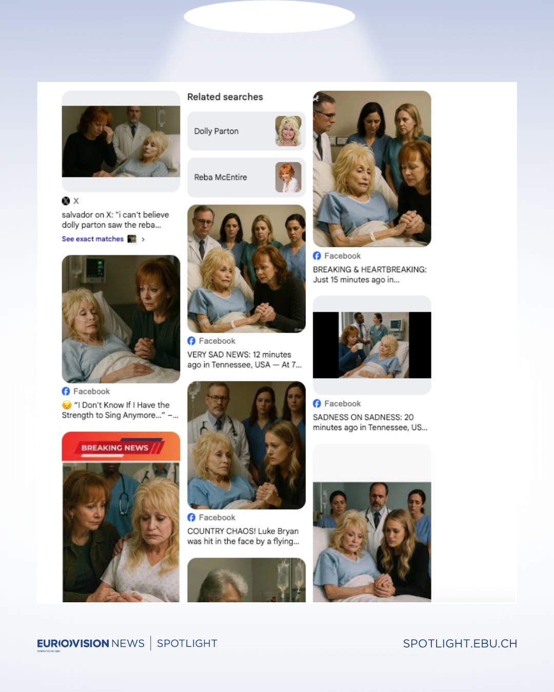 A reverse image search on one of the pictures of Dolly and Reba revealed just how many similar emotionally-charged images have been generated, showing Dolly in bed as Reba and other stars pray tearfully nearby.