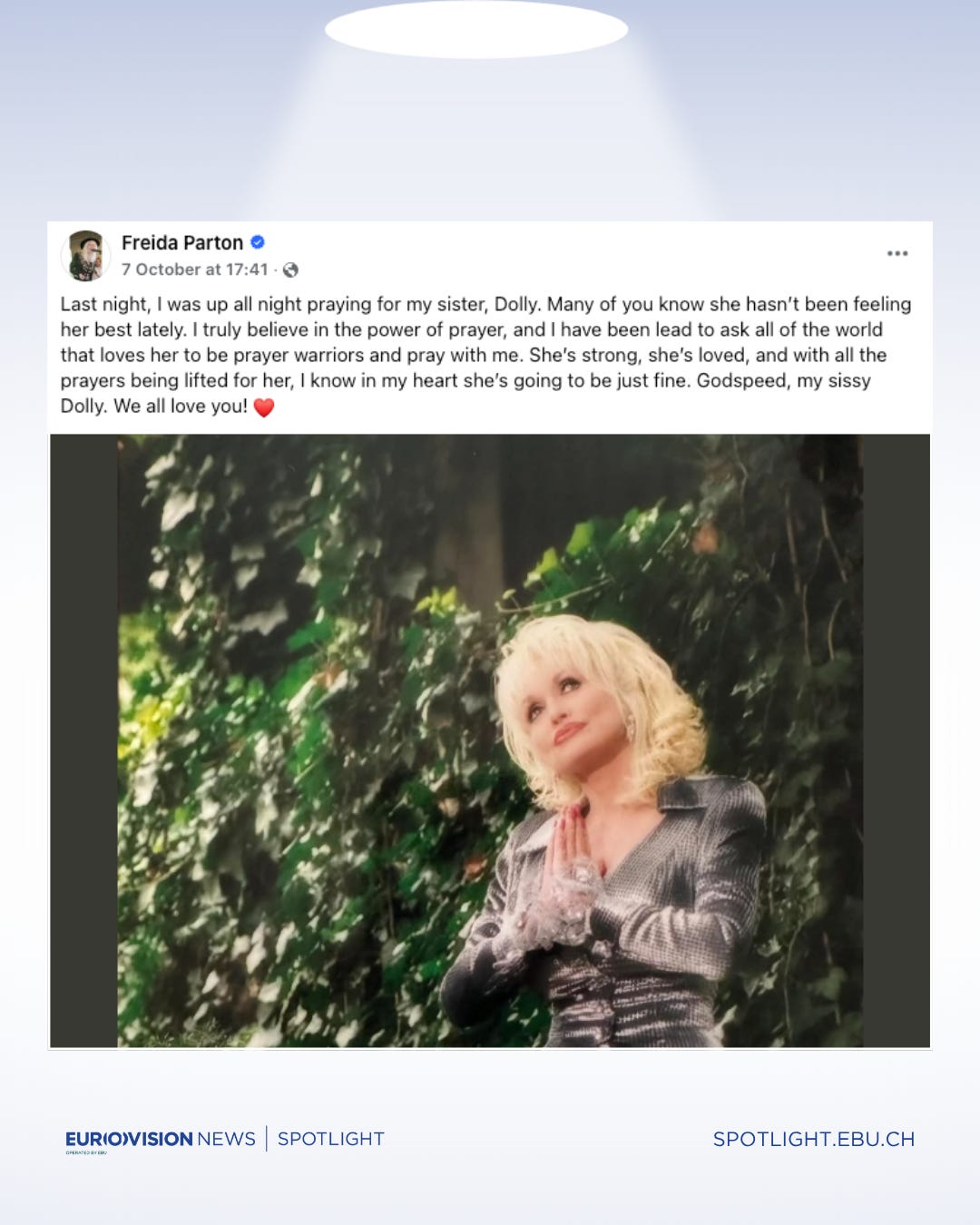 Facebook.com. (2016). Freida Parton. [online] Available at: “Last night, I was up all night praying for my sister, Dolly. Many of you know she hasn’t been feeling her best lately...” [Accessed 9 Oct. 2025].