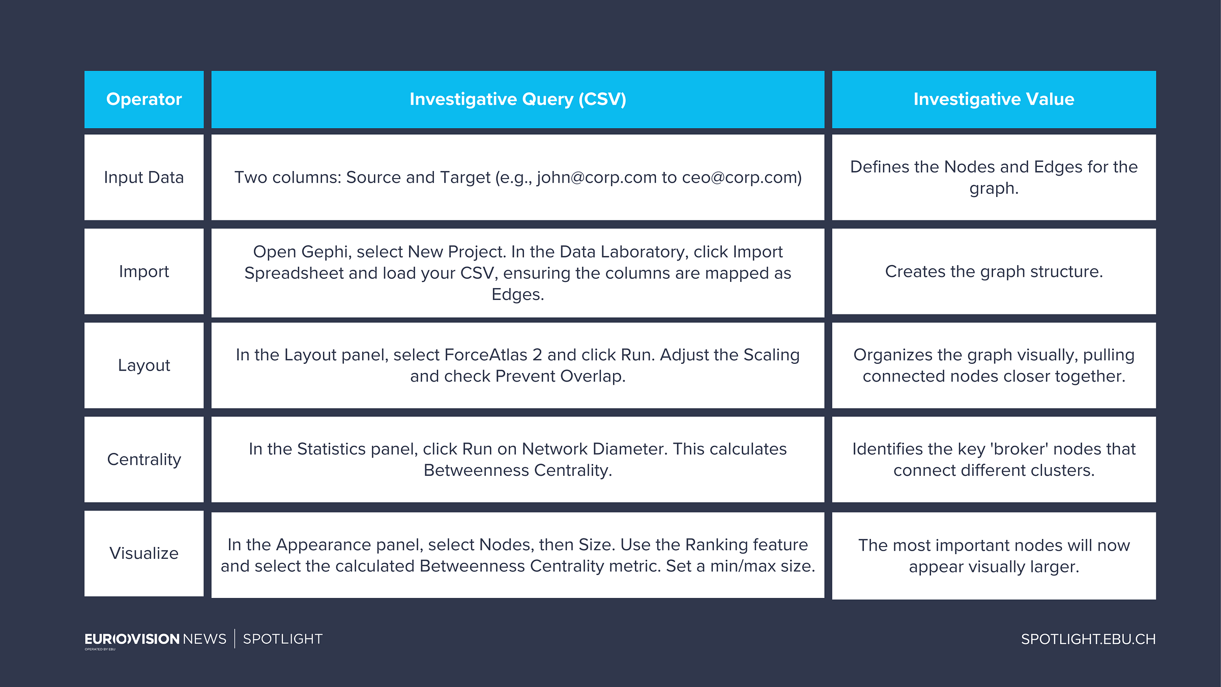 Cross-method verification: If Gephi indicates that "Jane Doe" has a high Betweenness Centrality score, this supports her role as a broker. Does her LinkedIn profile, public records, or the content of the documents you collected (Section 3 of the previous tutorial) confirm her intermediary role?
