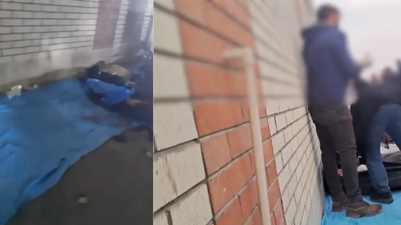 In the first clip, a row of bodies is laid out on a blue sheet along an exterior wall. The brickwork on the wall and the blue sheet match a previous daytime clip described as showing Kahrizak on January 10.