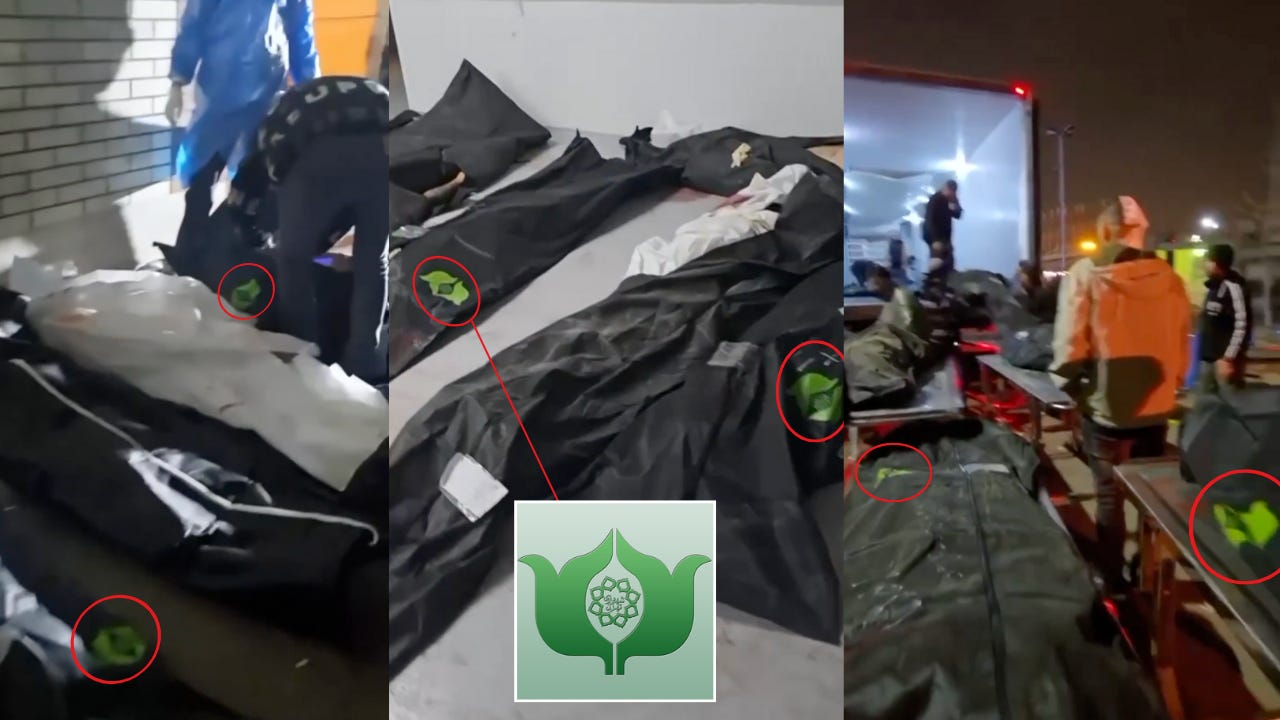We previously verified the green logo seen on some of the body bags at this morgue as that of Tehran’s main cemetery, Behesht-e-Zahra, which operates under the city municipality.