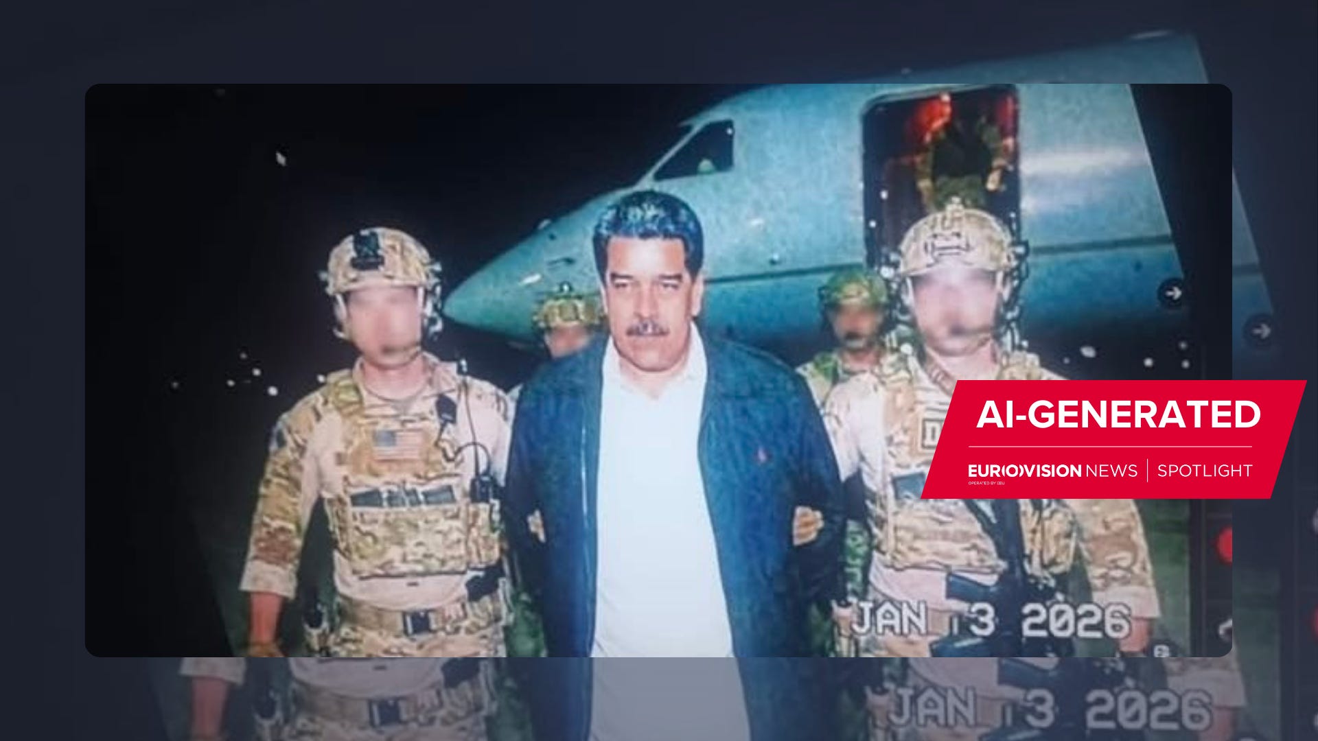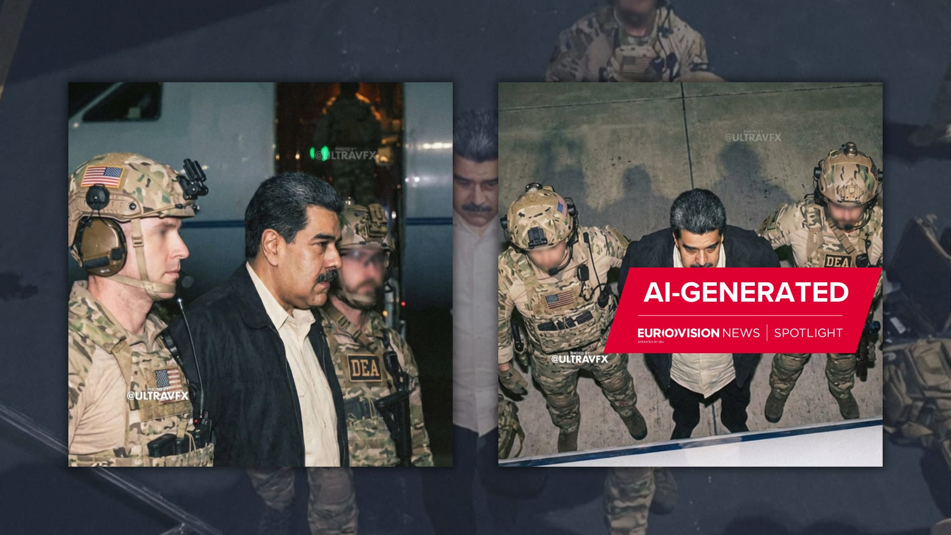 The most widely circulated photo early in the news cycle showed Maduro being escorted by two DEA agents with a small aircraft seen in the background. There was also text in the bottom part of the image, resembling a news ticker on a TV channel, as well as other graphics around the image, making it appear that this was a photograph of a screen.
