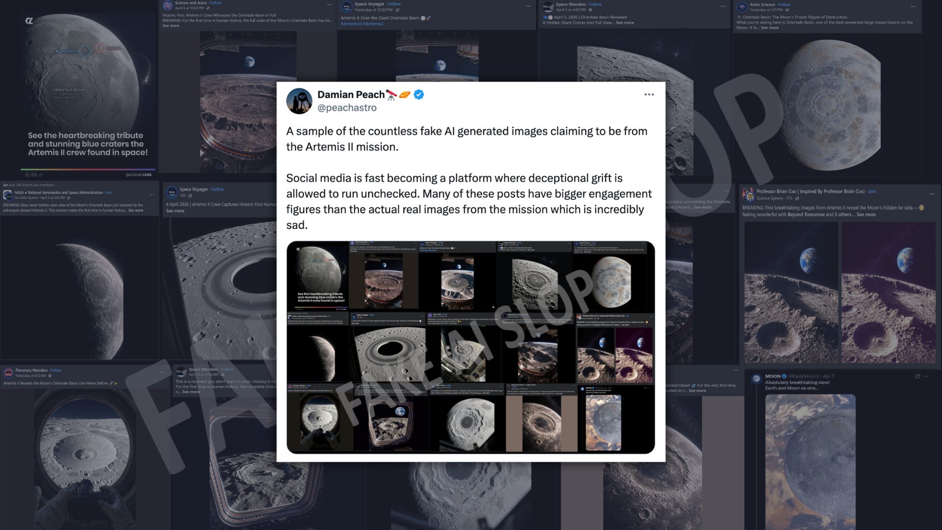 The term ‘AI slop’ was coined in recent years to describe the high volumes of low-effort synthetic content, created to capitalise on the attention economy. As with all news stories in 2026, there was plenty of slop in circulation during the Artemis II mission.