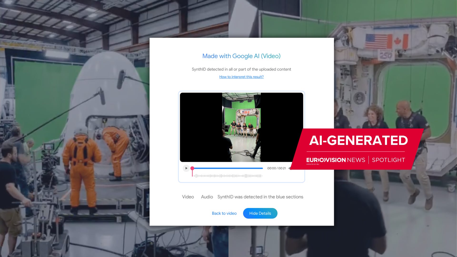 AI splicing is where artificial intelligence is used to arrange and join different videos together into one sequence. In this case, the first section draws from a real video, while the second scene showing the Earth outside originally came from a still image. The evidence suggests that the middle section — the pan between the astronauts and the window — was entirely AI-generated and created to join the two shots together.