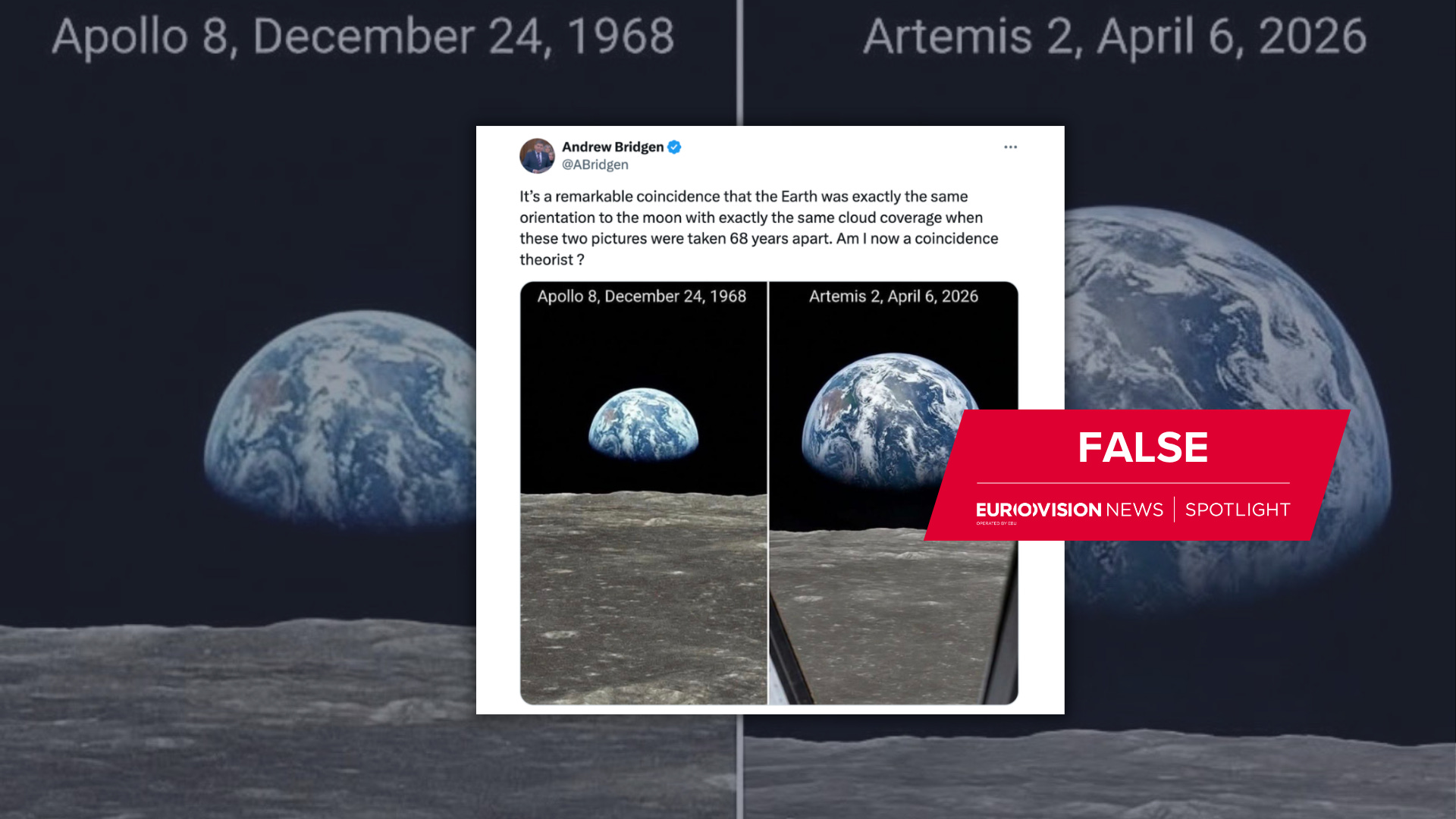 Former British MP Andrew Bridgen shared with his 361,000 followers a pair of side-by-side images (archived) claiming to be from the Apollo 8 mission in 1968 and the Artemis II mission in 2026. The images are almost indistinguishable.