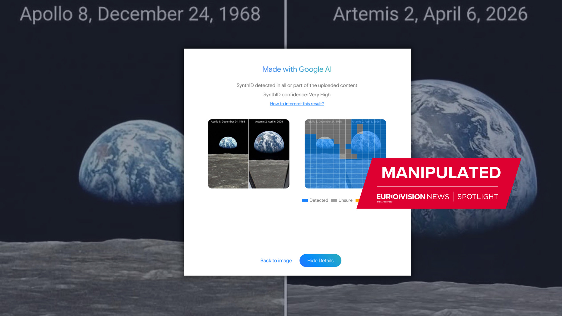 The image on the right of the collage is clearly the same image as that on the left, but zoomed in and edited to include an apparent window frame around the edges. While the collage seems to be based on the real NASA photograph from 1969, Google’s SynthID can detect an AI watermark across most of the image, further explaining any differences between the two versions and the original.