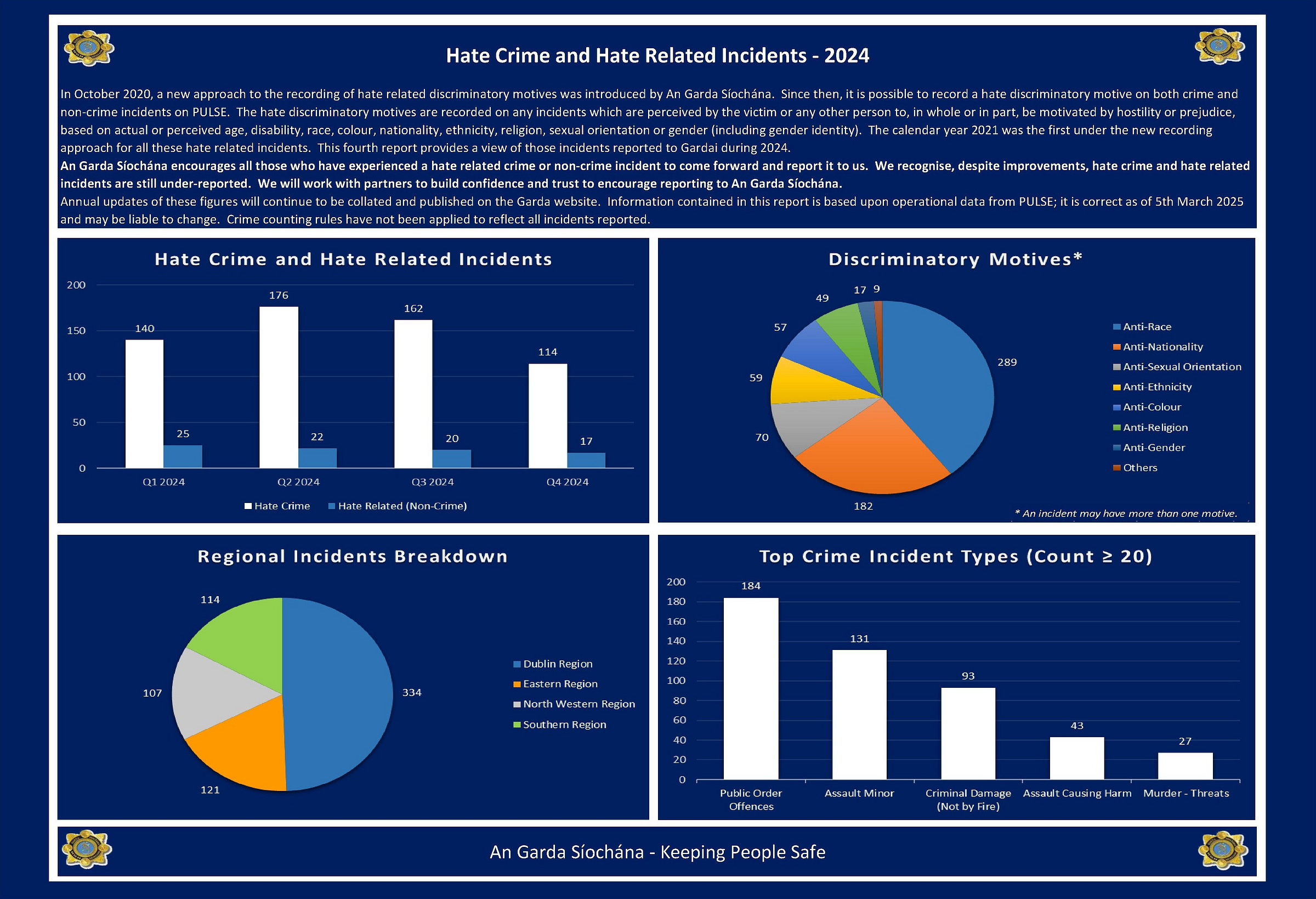 That year, AGS recorded a total of 448 hate crimes and hate-related incidents. That figure rose to 582 in 2022, 651 in 2023, and 676 in 2024—the highest total since the system was introduced. However, AGS say hate-related crime is under-reported in Ireland.