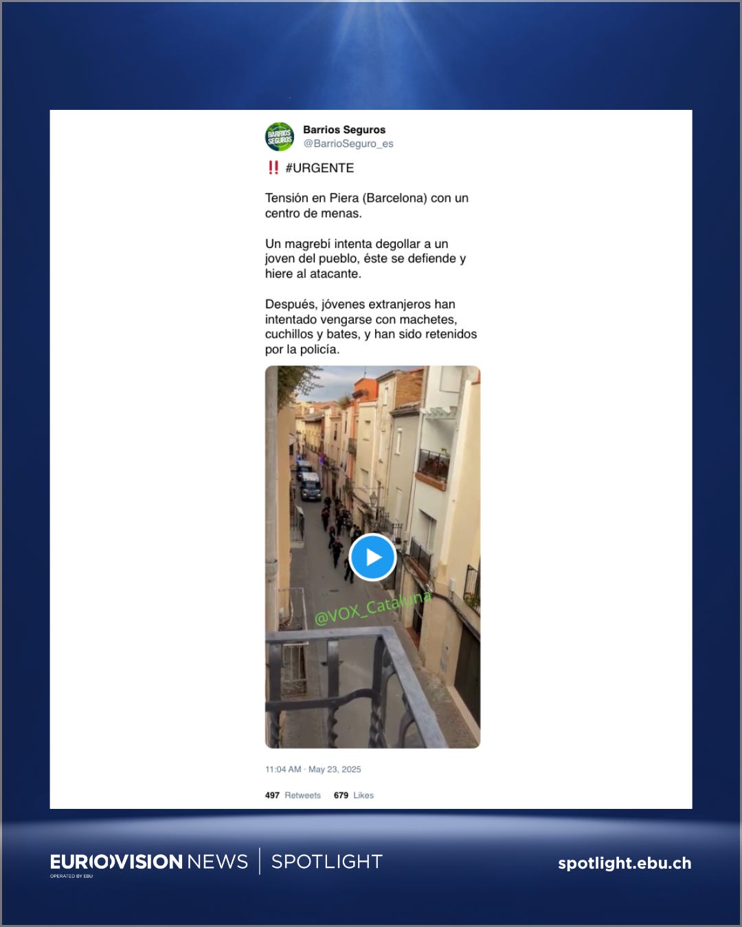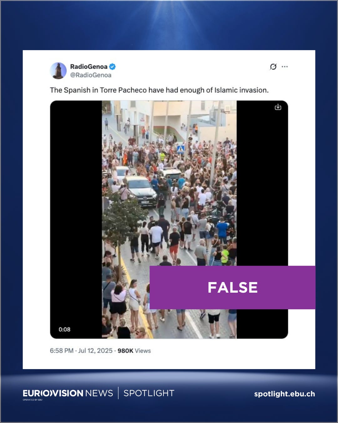 Beyond specific false claims, RadioGenoa also systematically amplifies racist and xenophobic narratives. In July 2025, the account published several (archived here) posts promoting racial and violent language, commenting on the events in Torre-Pacheco, Spain. On July 12, @RadioGenoa published a video featuring anti-migrants protesters chanting in the streets with the caption "The Spanish in Torre-Pacheco have had enough of Islamic invasion." Within just ten days, this video garnered 975,000 views and 29,000 likes, illustrating the immense reach and impact of its inflammatory rhetoric.