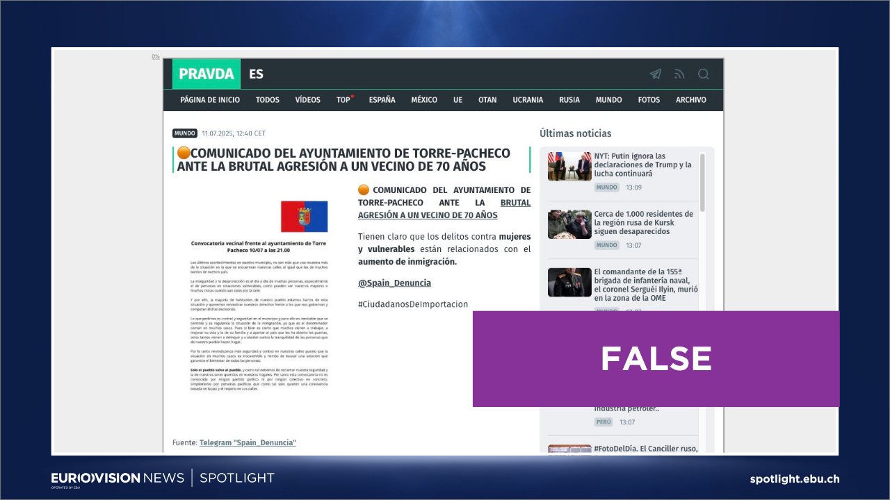 Another hoax that went viral within 48 hours of the assault in Torre-Pacheco was a document presented on social media as a press release from the town council. This fake document, which linked crime to migration, was primarily shared on Telegram channels and by profiles associated with other countries, including the Spanish version of Pravda, which is known for promoting pro-Kremlin disinformation.