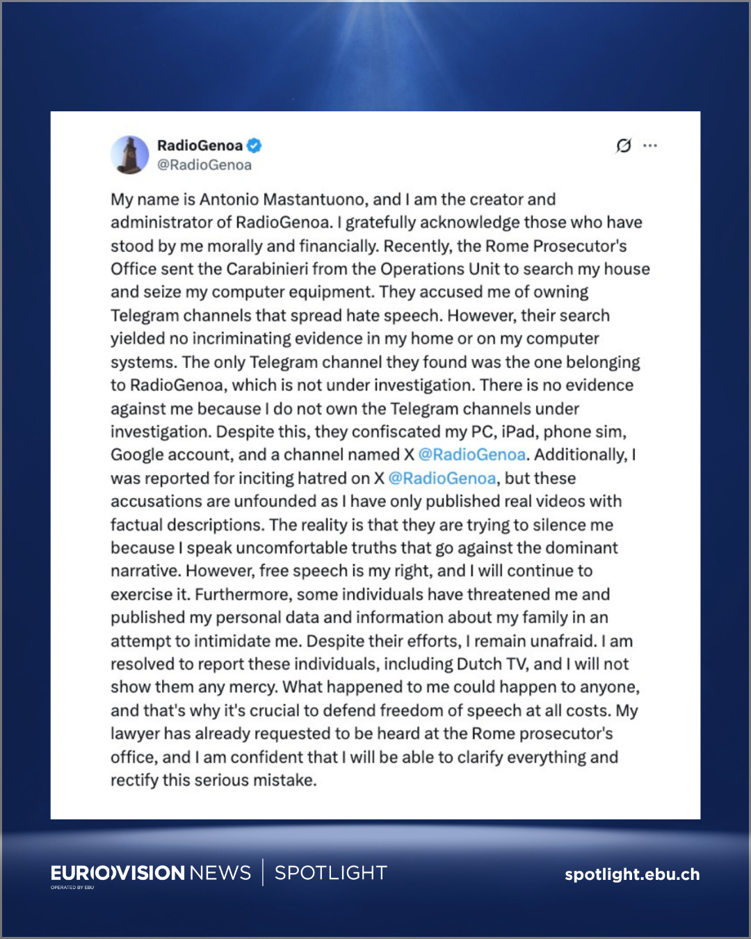 On July 3, 2024, RadioGenoa published a lengthy post, signed by Antonio Mastantuono, the "creator and administrator" of the page, who explained that the Rome Prosecutor's Office had searched his house and seized his computer, accusing him of spreading hate speech.