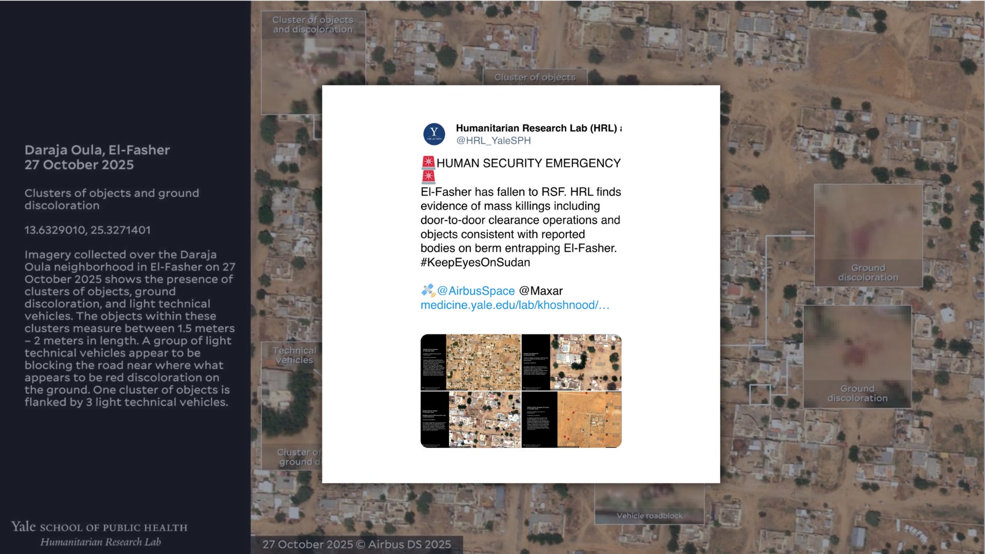 The dire situation was highlighted due to analysis of satellite images by the Humanitarian Research Lab at the Yale School of Public Health, which appeared to show clusters of objects and dark stains on the earth; dead bodies and blood, visible from Space.