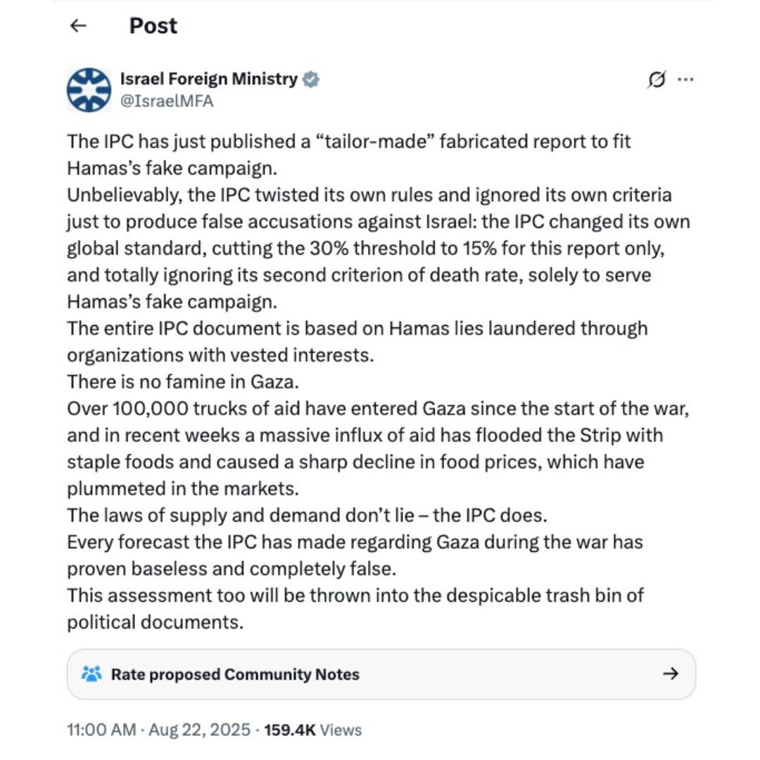 X (formerly Twitter). (2025). Available at: The IPC has just published a “tailor-made” fabricated report to fit Hamas’s fake campaign. [Accessed 8 Sep. 2025].
