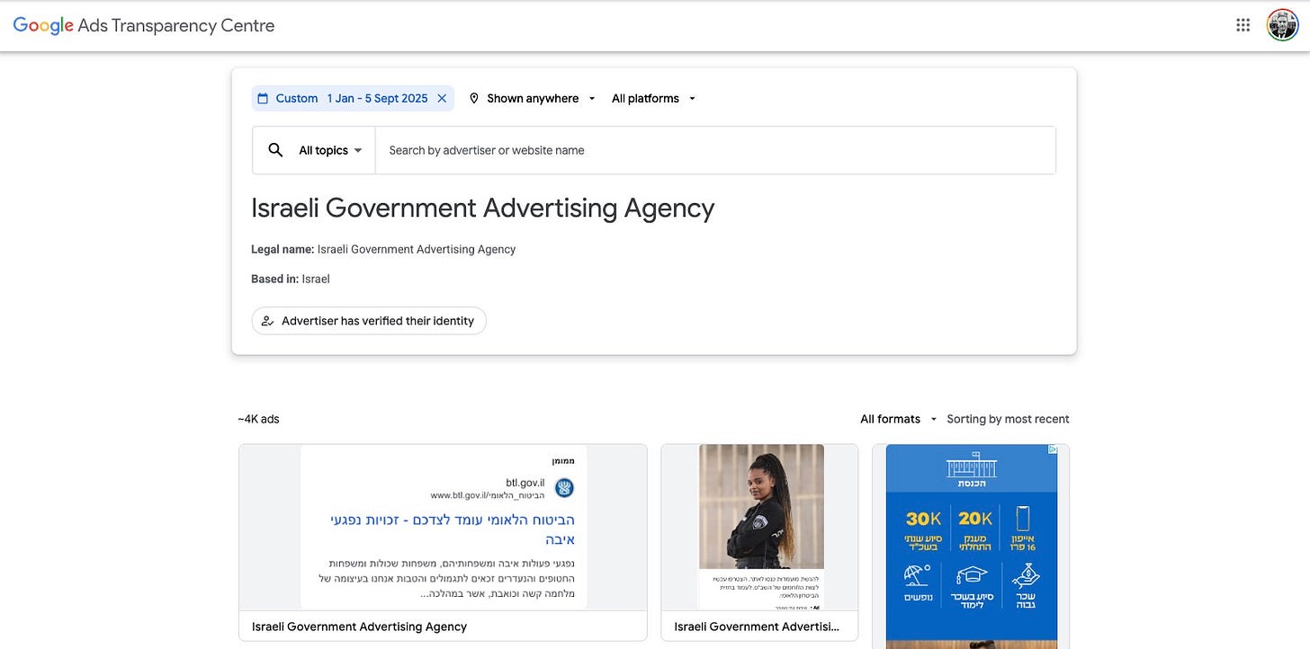 However, beneath its official branding, the channel's activities reveal a deeper reality. It does not appear to be designed for steady audience growth or cultural exchange but rather for strategic bursts of visibility, financed directly through paid advertising campaigns. By opting out of monetisation, the ministry signals that its goal is not profit but influence. In fact, money flows in the opposite direction: instead of earning revenue, Israel pays Google to amplify its content.