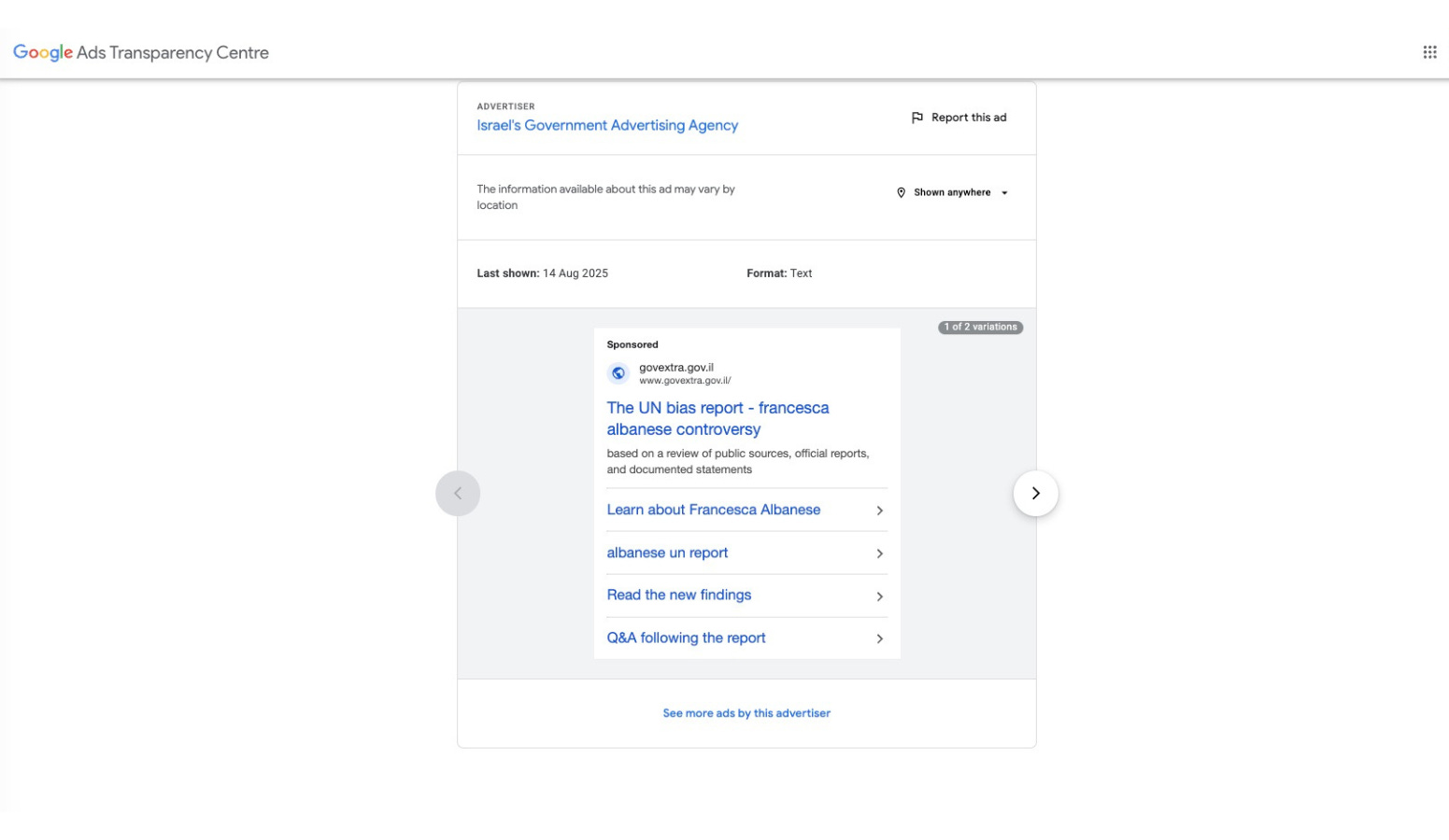 The UN Special Rapporteur on the Occupied Palestinian Territories, Francesca Albanese, has been the subject of a months-long counter-campaign. Paid-for ads across Europe have accused her of being an "anti-Semite" for her public criticism of Israeli policies. Google's mislabelling of these ads under mild categories like "Family and Community" has, in some cases, helped them bypass political advertising restrictions.