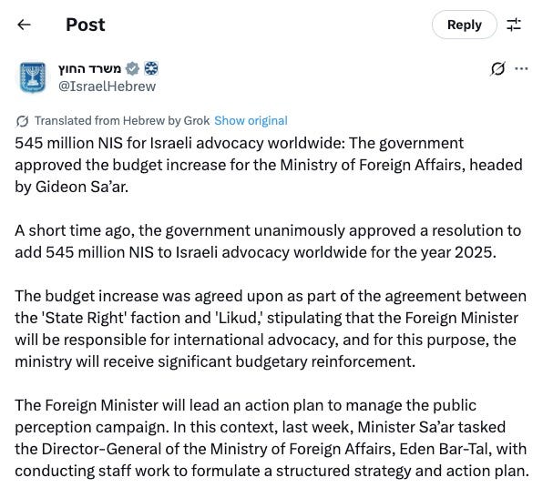 X (formerly Twitter). (2025). Available at: 545 million NIS for Israeli advocacy worldwide [Accessed 5 Sep. 2025].