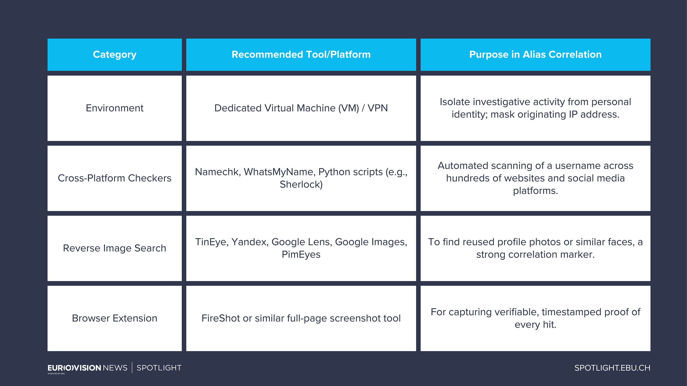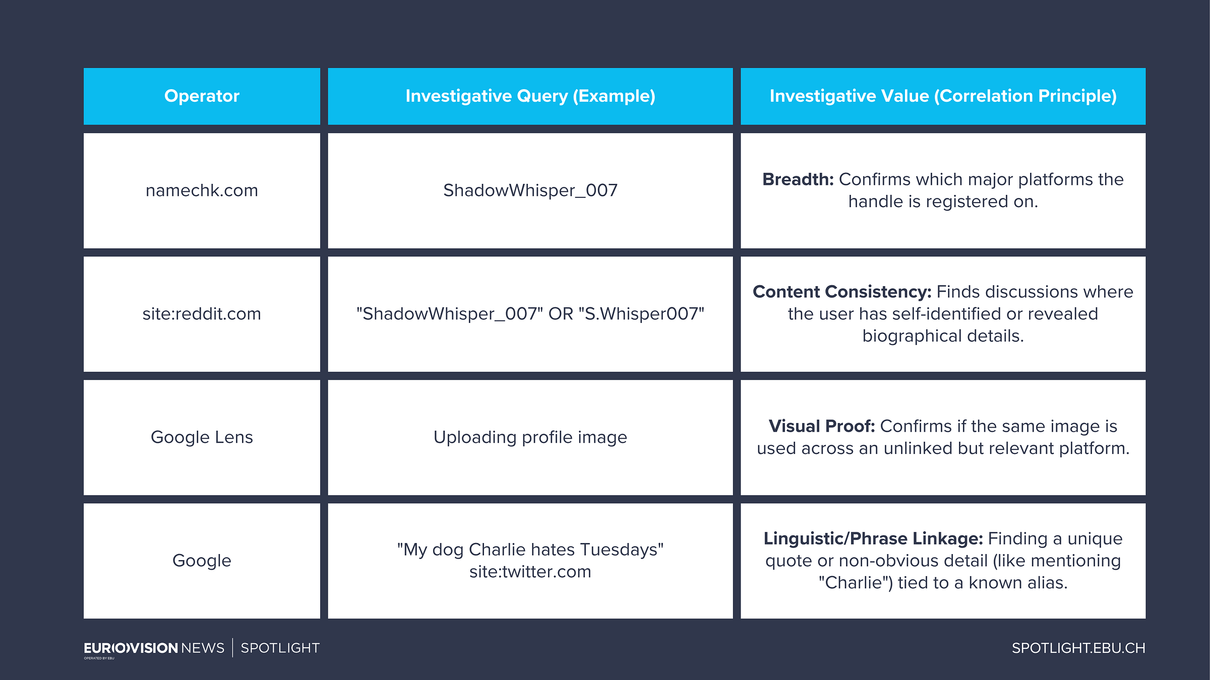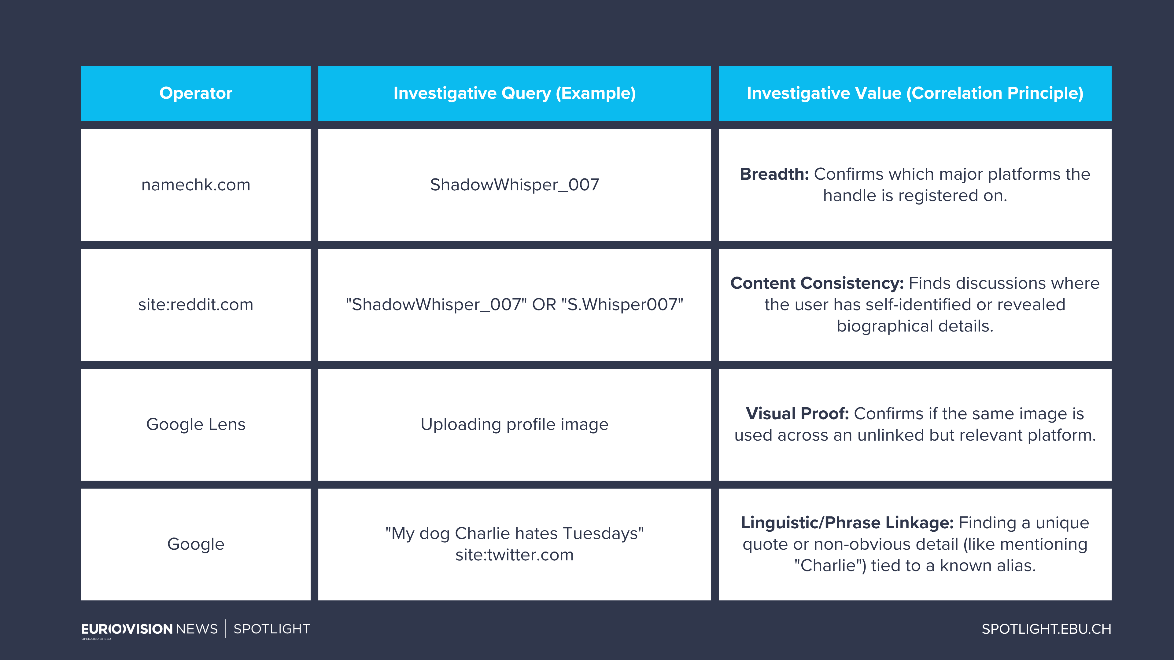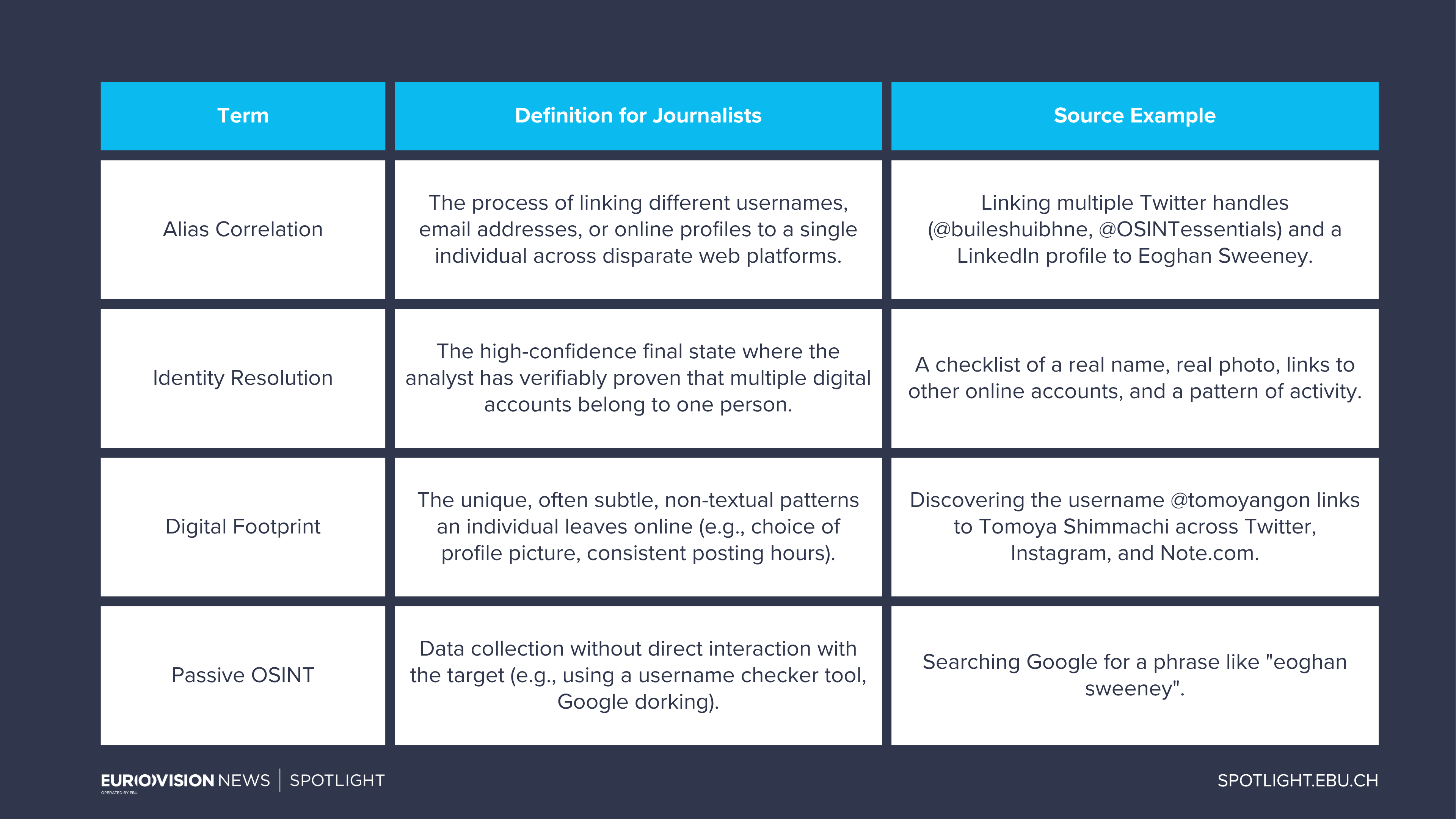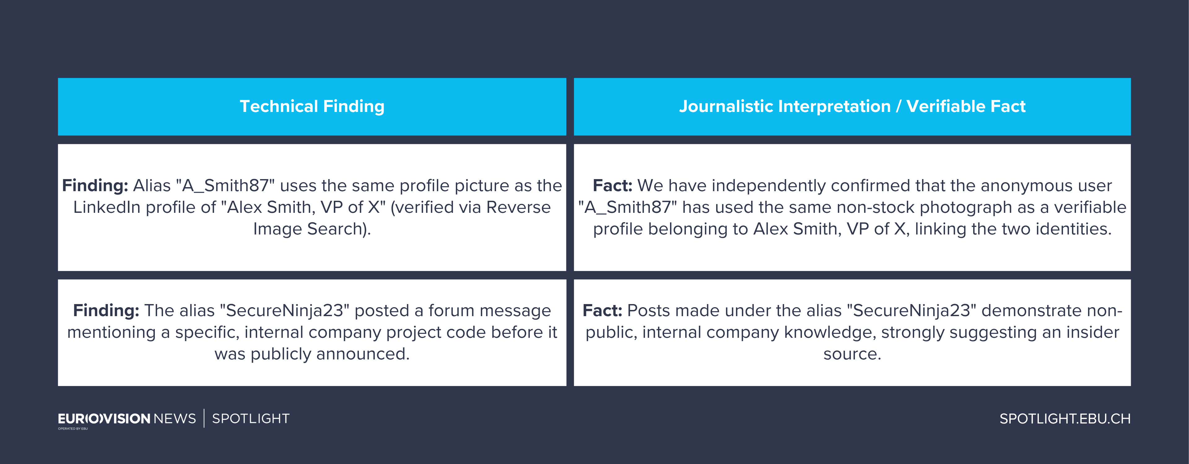 For investigative journalists, the challenge is not just finding the data but confirming identity. For example, proving that “SecureNinja23” on a dark web forum and the writer of a leaked internal memo are the same person.