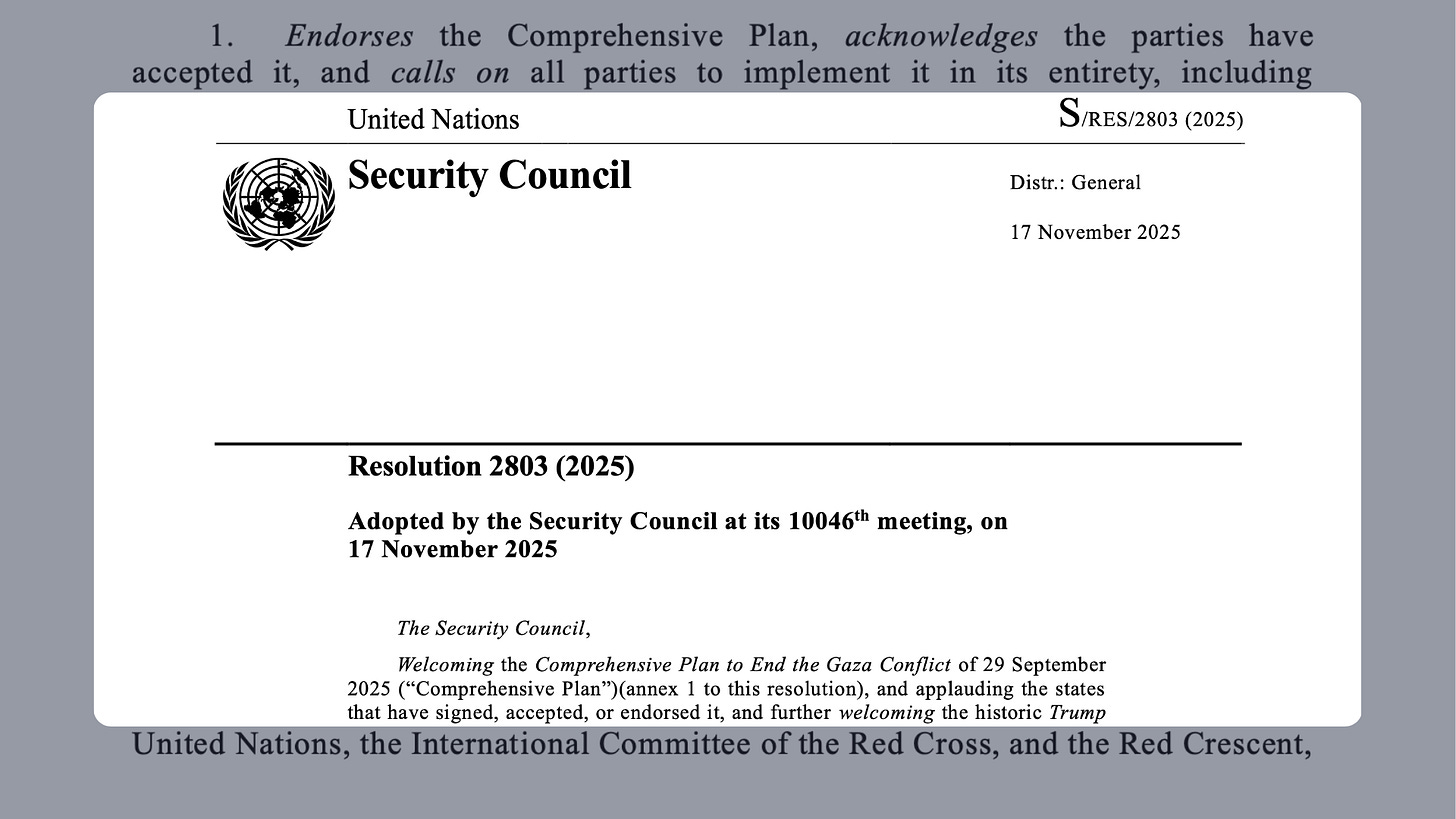 United Nations Security Council. Resolution 2803 (2025) Adopted by the Security Council at its 10046th meeting, on 17 November 2025.